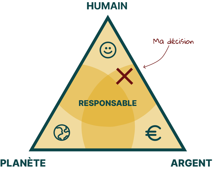 Dans ce qui est raconté ci-dessous (et pour d’autres articles à venir), nous allons considérer qu’une décision responsable est une décision qui prend en compte les impacts qu’elle va générer sur le triptyque : Humain / Planète / Argent.