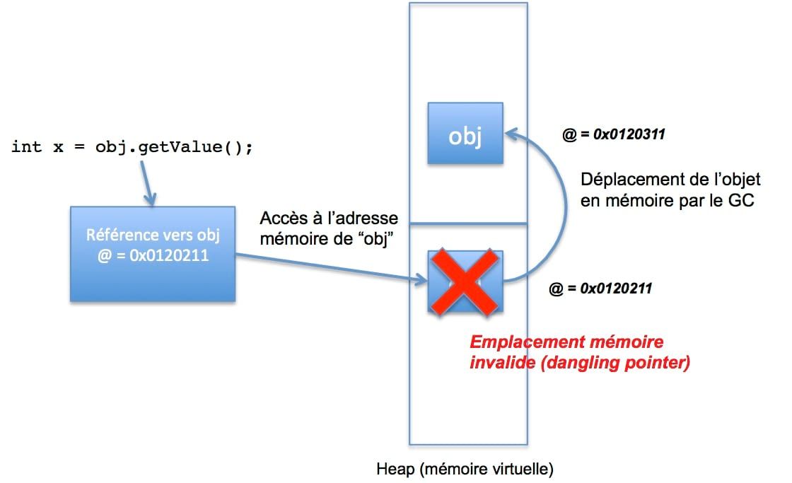 Si la page mémoire contenant l'objet pointé est protégée, l'objet (ou un autre stocké dans la page) est en train d'être déplacé en mémoire : le deuxième invariant est cassé et l'adresse de la référence est mise à jour.