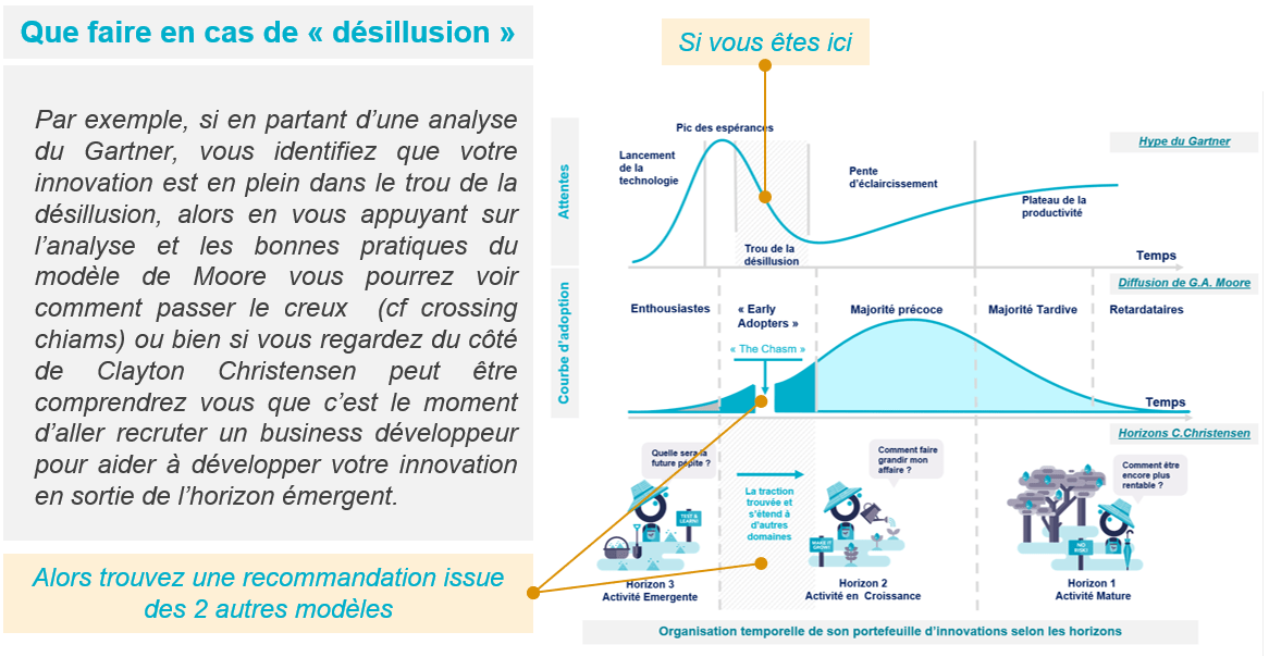 On l’a dit, la cohérence des 3 modèles témoigne de leur solidité et de leur complémentarité en terme de perspective d’analyse et surtout d’accompagnement et de diffusion de l’innovation. En d’autres termes, vous pouvez utiliser les 3 en même temps pour accompagner votre portefeuille d’innovations et tirer partie des bonnes pratiques de chacun d’entre eux.