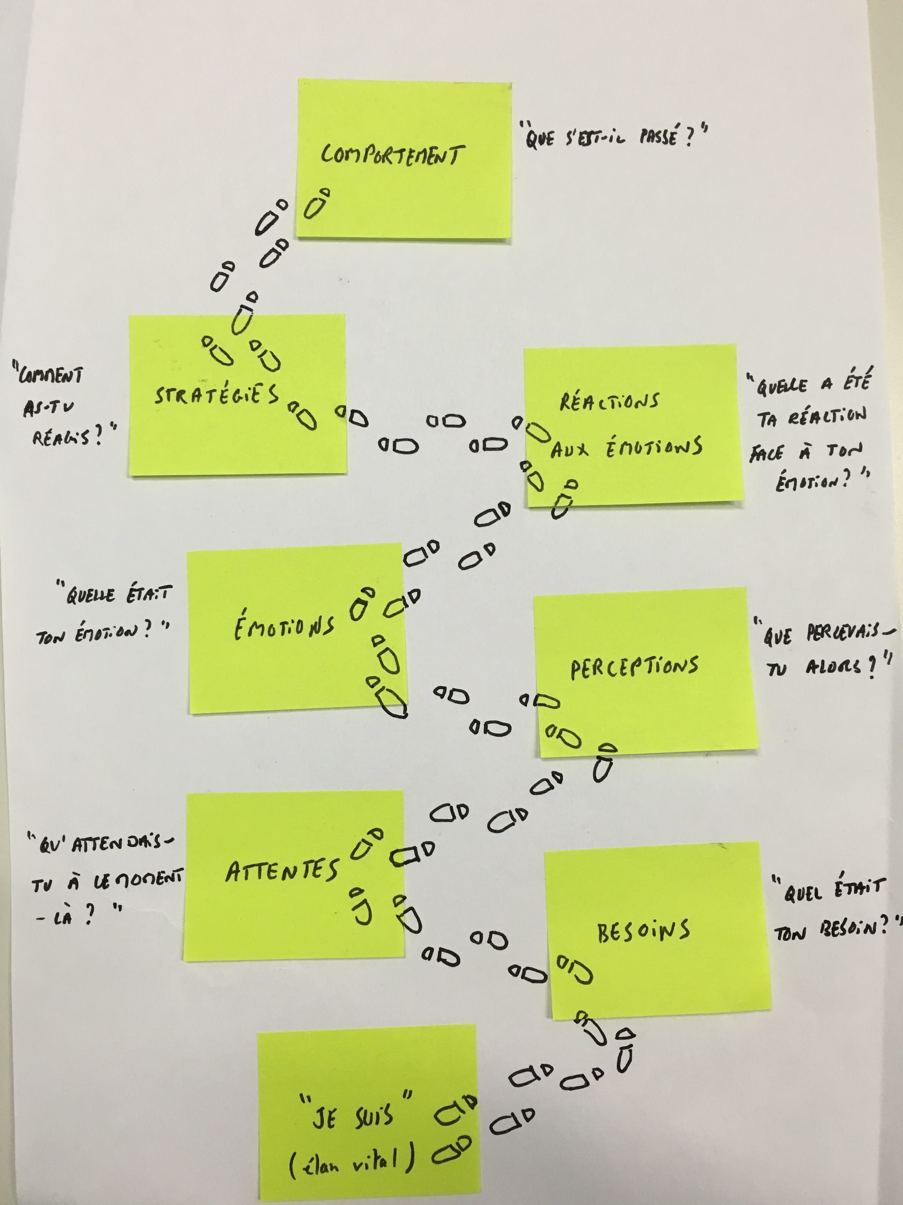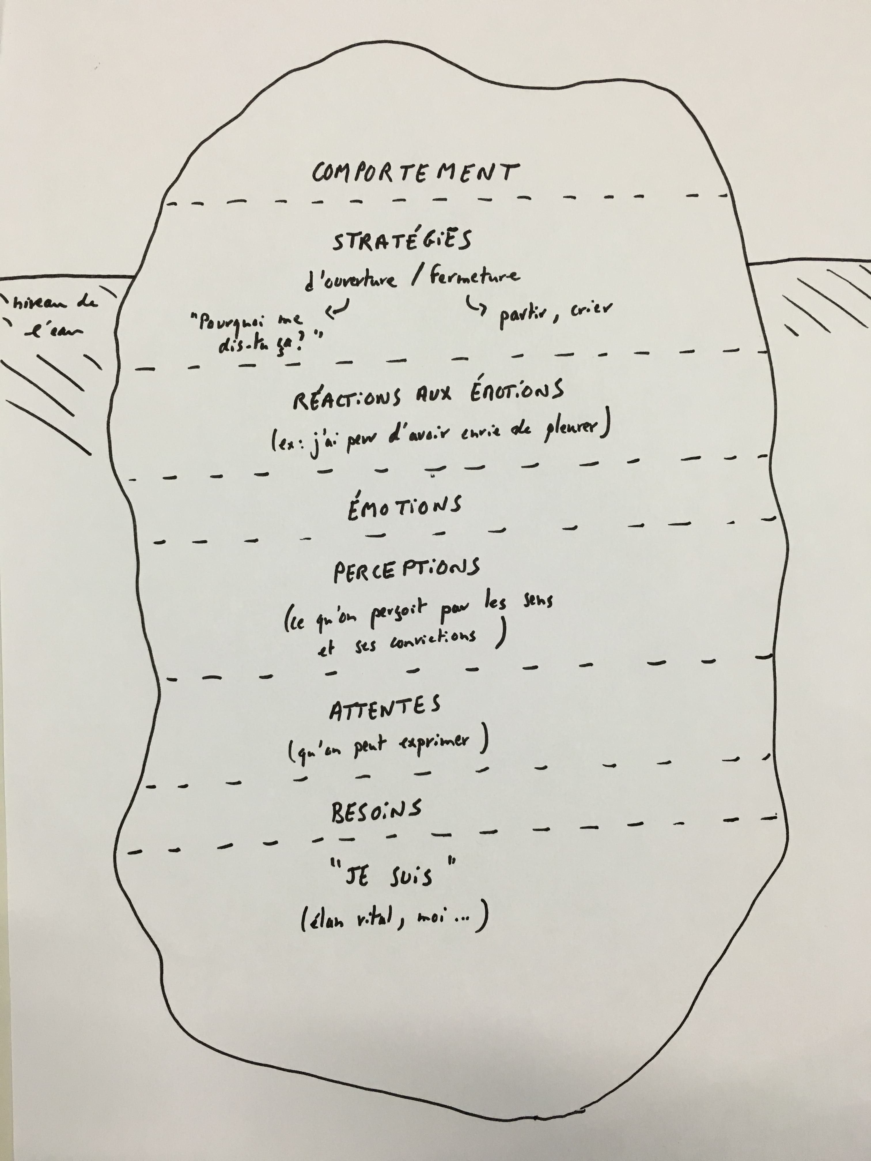 Explorer l'iceberg pas à pasExplorer l'iceberg pas à pas Le modèle de l'iceberg de SatirLe modèle de l'iceberg de Satir Emmanuel Gaillot et Raphaël Pierquin nous ont proposé de chercher plutôt à l’intérieur, en utilisant le modèle de l'iceberg de Virginia Satir. En disposant sur le sol des feuilles A4 représentant chacune des zones de l’iceberg, je peux littéralement me déplacer entre ces zones pour explorer un événement qui m’a posé problème. Un partenaire / coach peut, par ses questions, m’aider dans mon exploration du problème.