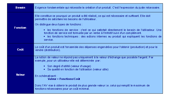 Ainsi quatre mots peuvent résumer les notions fondamentales de l’Analyse de la Valeur : Besoin, Fonction, Coût et Valeur. Le tableau suivant définit chacun de ces termes: