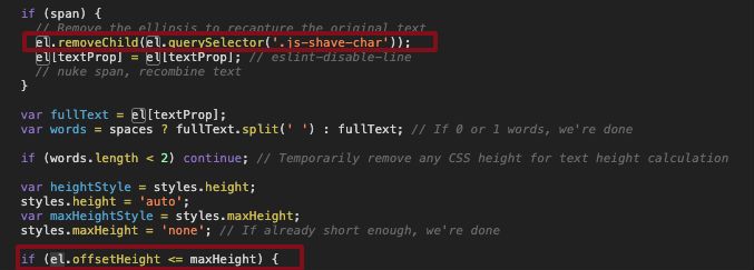 En allant vérifier la ligne de code mise en avant sur le profiler on retrouve bien la situation décrite ci-dessus. En effet, le code ci dessous va essayer de lire une valeur d’un élément qui a été modifié juste avant. Dans ce cas, un enfant de l’élément a été retiré, le navigateur doit donc refaire un layout pour pouvoir donner la valeur offsetHeight de celui-ci.