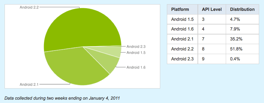 Depuis l'annonce de la version 2.3 de l'OS le 6 décembre dernier, Android est représenté par 5 versions majoritaires de l'OS. La répartition du 1er décembre 2010 montre une grosse domination des versions 2.1 et 2.2. On peut noter que la version 1.6 d'Android permet de toucher 95,3 % du parc et bénéficie de la gestion de multiples résolutions d'écran.