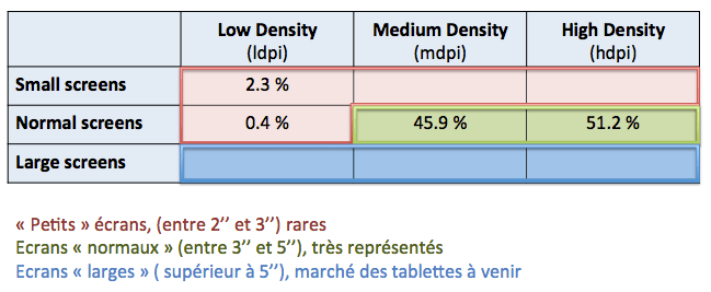 En se basant sur la répartition des tailles et résolutions d'écrans ci-dessous (les pourcentages sont les derniers donnés par Google en Août 2010), on peut prendre comme cas nominal une taille d'écran "normale" et réaliser des interfaces adaptées aux moyennes et hautes densités (respectivement "mdpi" et "hdpi").