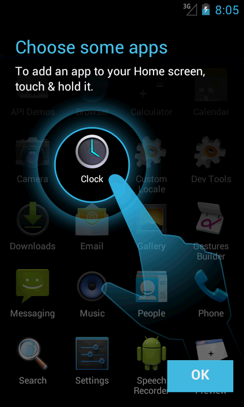 Si vous vous souvenez, la plateforme Android met en œuvre un processus de ce genre. Par exemple, lors d'une première ouverture de votre bureau sur Android, vous pouvez voir un petit tutoriel vous expliquant comment déplacer une application vers votre bureau. Ci-contre une capture d'écran de ce tutoriel pour vous rappeler votre première installation.
