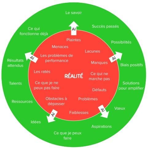 | Ap·pre·ci·ate [uh-pree-shee-eyt***] verb 1. Être reconnaissant pour quelque chose ; 2. Estimer grandement ; 3. Être pleinement conscient de, détecter ; 4. Reconnaître combien une personne ou une chose est bonne et le/la valoriser ; 5. Augmenter en estime <br>Dans chaque situation quelque chose fonctionne. <br>→ Apprendre en s’inspirant d’exemples exceptionnels et construire en se basant dessus. <br>Plus on se focalise certaines choses, plus augmente les possibilités qu'elles se produisent. <br>→ L’énergie circule là où notre attention se trouve. <br>Le langage utilisé forge notre vision du mond*e. <br>→ Le verre est-il à moitié plein ou à moitié vide ? | In·quir·y [in-kwahyur-ee] n**oun 1. Rechercher l'information, ou le savoir ; 2. L’action d’enquêter ou de rechercher de l’information en questionnant dans le but d’apprendre et de changer ; <br>Les Personnes, Organisations et Systèmes avancent en fonction : <br>→ des questions qu’ils posent. <br>→ des histoires qu’ils racontent et qu’ils se racontent. <br>→ des images du futur qu’ils créent. <br>Le changement commence avec les premières questions qu’on se pose et que l’on se pose ! <br>→ Il nous faut donc les choisir avec une très grande attention. |