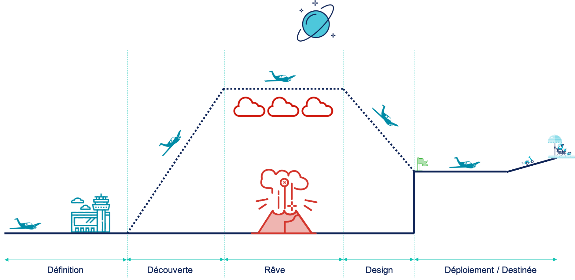 A noter qu’il est absolument nécessaire de co-concevoir cette phase avec le client, en explorant comment l’organisation a fait du design avec succès dans le passé et quelles modalités fonctionnent le mieux pour l'organisation dans le présent. Souvent, une telle exploration met à jour des possibilités nouvelles et encore plus intéressantes dans chaque situation.