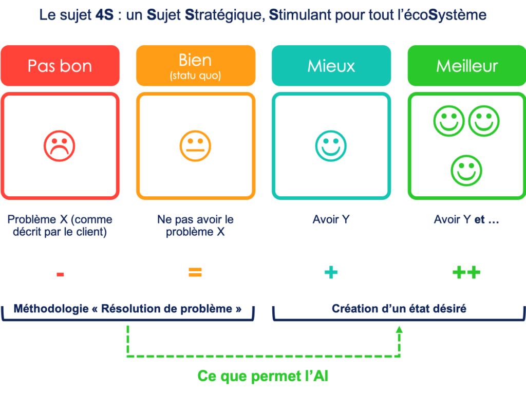 On peut donc voir une certaine similitude entre le “Futur Préféré dans Solutions Focus” et le “Rêve dans l’AI”. Cependant il y a une différence importante entre les deux : l’angle d’attaque. Dans l’AI, le rêve s’appuie sur l’amplification d’un moment passé mémorable afin de décrire une vision possible du futur souhaité. Là où Solutions Focus nous amène à imaginer complètement quelle pourrait être la situation future sans aucune contrainte (et ensuite de puiser dans ce qui a marché par le passé pour nous rapprocher de ce futur préféré).