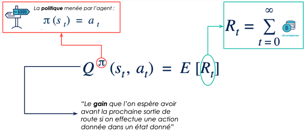 - On cherche à entraîner un oracle (le réseau de neurones) qui pour un état donné nous dit : si j’entreprend telle action, je suis censé accumuler telle récompense avant de sortir de la route.