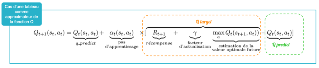 Si l’on change la représentation de notre fonction de valeur Q, on doit également changer notre méthode de mise-à-jour lors de l’entraînement. Souvenez-vous de l’équation de Bellman décrite dans l’article précédent et rappelée en figure 5, elle permet de remplacer une valeur par une autre en fonction de la récompense obtenue pour affiner l’estimation.