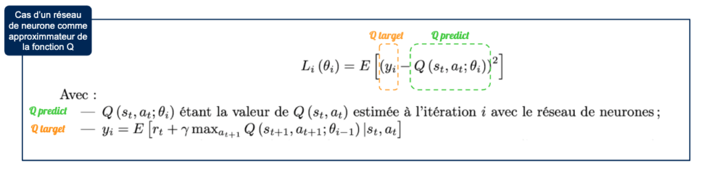 Le principe reste donc le même que précédemment, à chaque mise-à-jour des paramètres de notre réseau de neurones, le réseau “tend un peu plus vers” une estimation correcte de la fonction de valeur Q. On peut donc supposer que si on s’entraîne suffisamment longtemps le réseau de neurones va converger et l’estimateur va devenir bon.