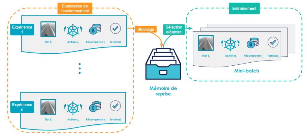 Le principe de l'experience replay [Lin, 1992] est d’utiliser une mémoire de reprise (replay memory) pour stocker les transitions observées lors de l’exploration de l’environnement de la part de l’agent puis les sélectionner aléatoirement à chaque étape de l’apprentissage. Ces tuples de transitions sont des quintuplets de la forme (st, at, rt, st+1, terminalt) (terminal étant un booléen indiquant si l’état est terminal ou non) correspondant à une seule étape de l’exploration de l’environnement. Lors de l’étape de mise à jour des paramètres du réseau de neurones, on sélectionne aléatoirement les expériences à l'intérieur de cette mémoire de reprise plutôt que de s’entraîner sur la dernière expérience observée ce qui évite d’introduire un biais lors de l’apprentissage. Ce principe est résumé en figure 8.