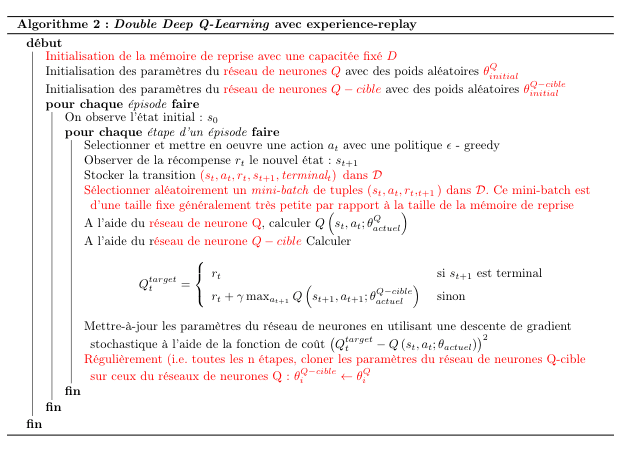 Le Double Deep Q-Learning (DDQL) est une version améliorée du DQL permettant de palier à l’une de ses faiblesses : la surestimation de l’importance de certaines actions dans certaines conditions [van Hasselt et al., 2015].