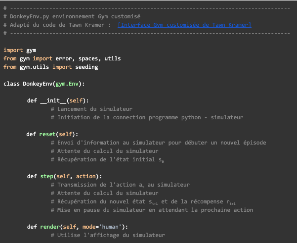 Mettre en place cet environnement n’est en réalité pas une mince affaire. Il faut apporter des modifications aux codes sources cités desquels nous sommes repartis, mais de telles considérations nous emmeneraient en dehors du sujet de cet article. Ici, il s’agit simplement de comprendre que nous nous sommes outillés d’une librairie Python customisée nous fournissant toutes les méthodes utiles à l’interaction de notre algorithme avec notre simulateur.