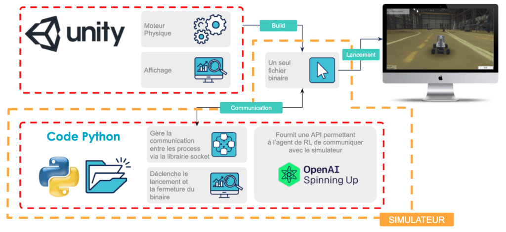 Pour notre cas d’usage, nous allons utiliser le simulateur Donkey Car dans sa version proposée par Tawn Kramer [Code source du simulateur Donkey de Tawn Kramer]. Ce simulateur est un code source écrit en C# qui, compilé à l’aide du logiciel d’édition de jeux vidéos 3D Unity, permet de générer un fichier binaire. Pour interagir avec le processus correspondant à l’exécution de ce fichier binaire, nous utilisons une interface Gym customisée selon le modèle décrit précédemment (reconstruite à partir de celle de Tawn Kramer [Interface Gym customisée de Tawn Kramer]). C’est dans l’implémentation des classes et méthodes de cette interface qu’on gère la communication avec le simulateur via le réseau local. Par la suite, nous utiliserons le terme de simulateur pour désigner l’ensemble formé par le fichier binaire compilé à l’aide d’Unity ainsi que le wrapper Python (implémentation de l’interface Gym customisée) comme résumé en figure 12.