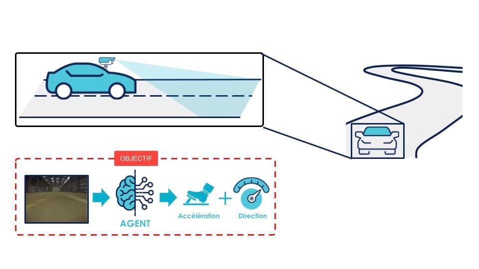 Afin d’explorer de nouvelles possibilités concernant la conduite autonome, de nombreuses compétitions de mini-voitures autonomes existent telles que la compétition de l’Iron Car ou encore la compétition Donkey ® Car aux États-Unis. Lors de ces compétitions, des mini voitures (type voitures radiocommandées) doivent parcourir quelques tours d’un circuit faisant approximativement la taille d’un hangar. Dans cet article, nous allons étudier l’utilisation d’une solution d’apprentissage par renforcement (RL - Reinforcement Learning - pour les intimes) pour la conduite autonome selon le contexte schématisé en figure 1.