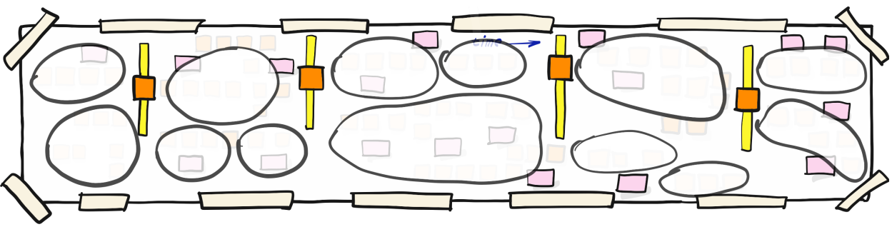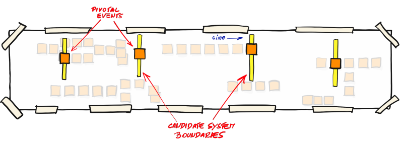 Sur la surface de modélisation, les participants commencent par délimiter les frontières des sous-domaines métiers afin de rendre explicite le découpage du domaine. Les événements qui apparaissent à la jonction de ces sous-domaines sont appelés événements pivots. Ils jouent un rôle clé : ils rendent visibles les points de passage entre domaines, facilitent la compréhension des interactions inter-domaines et servent de repères pour raisonner sur les dépendances et les responsabilités entre équipes.