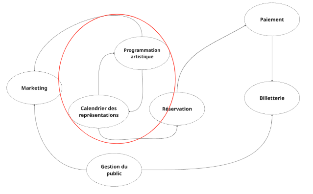 Dans cette instance de Context Mapping, on constate que le Bounded Context “Programmation artistique” est fortement couplé au Bounded Context “Programmation des représentations”. Les échanges fréquents entre ces deux contextes, par exemple lors de la définition d’une saison artistique, de l’ajustement des dates de représentation ou de la gestion des contraintes de disponibilité des artistes, constituent un signal clair d’un découpage excessif. Dans ce cas, maintenir deux contextes distincts introduit davantage de coordination que de valeur, et ces deux Bounded Contexts devraient probablement être regroupés en un seul afin de simplifier le modèle et le fonctionnement des équipes**.**