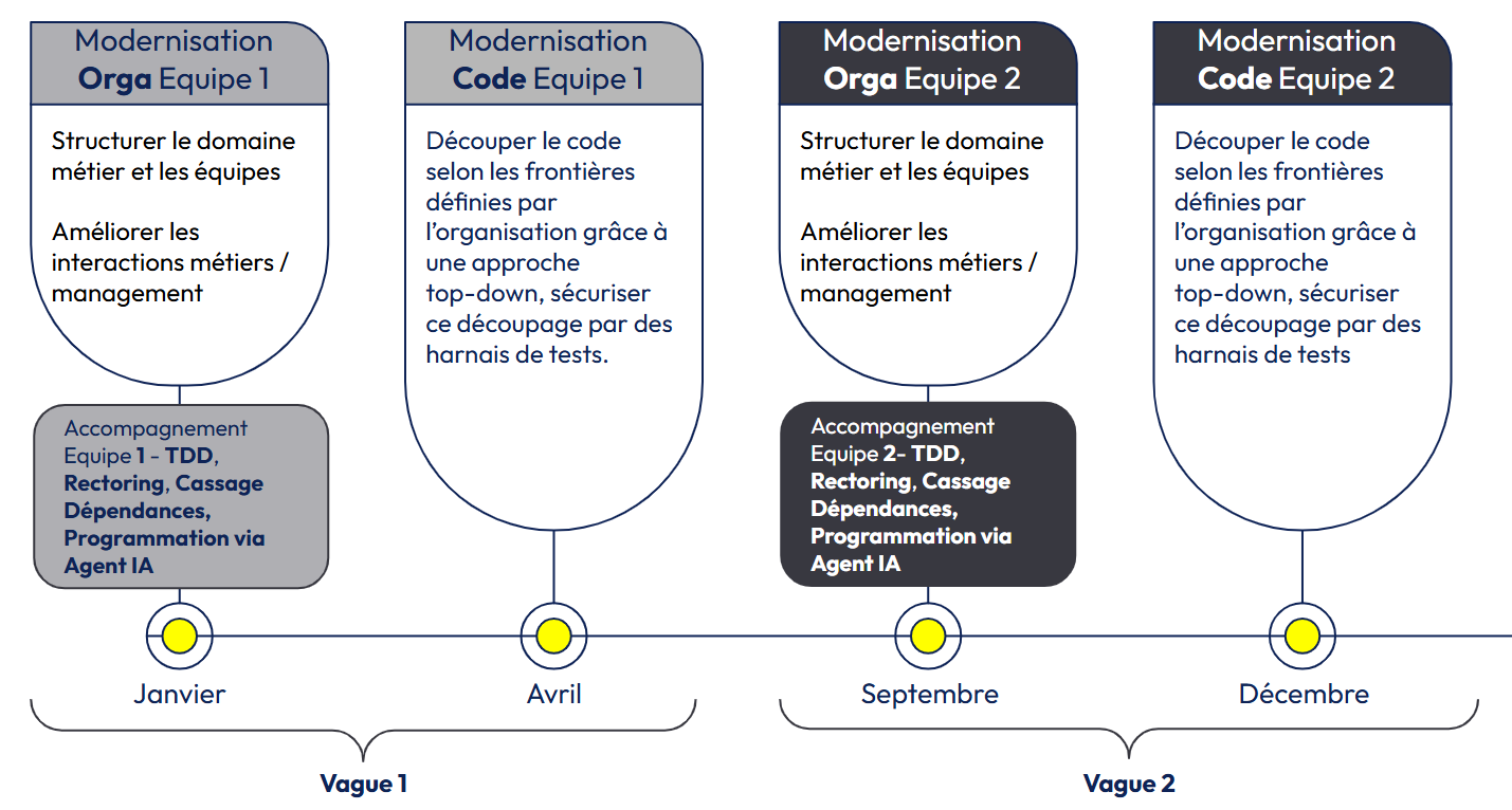 Plutôt que de viser une transformation globale, la modernisation est pilotée par vagues successives. Cette approche incrémentale permet de livrer régulièrement de la valeur, de limiter les risques et d’adapter le nombre d’équipes engagées en fonction des moyens disponibles. Chaque vague combine généralement une phase de transformation organisationnelle et une phase de modernisation du code, afin d’aligner pratiques, compétences et socle technique.
