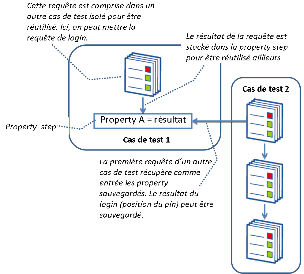 L’enchaînement de requêtes va permettre de simuler un utilisateur. Un Test Case soapUI (cas de test) exécute chaque requête qu'il contient. Plus généralement, un Test Case soapUI exécute chaque élément, appelés “étapes” (Step), séquentiellement. Une requête est une étape, une injection de propriété également :