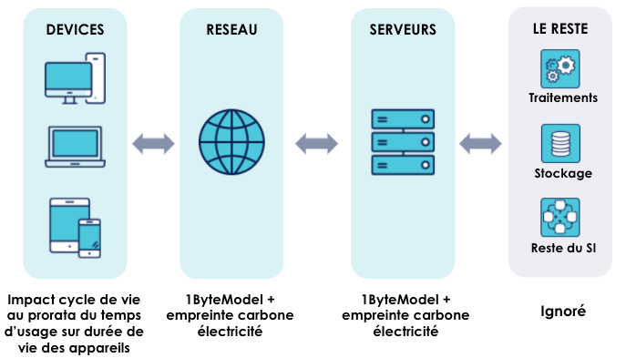 De plus, nous voulions intégrer dans cette estimation la quote part des émissions liées à la fabrication des terminaux utilisés pour bénéficier du service numérique : autrement dit, nous voulions estimer les émissions liées à l’usage des services vendus par OCTO (majoritairement des services numériques sur-mesures) en incluant une quote part des émissions liées à la fabrication des terminaux, réseaux et serveurs qui permettent de bénéficier de ces services numériques.
