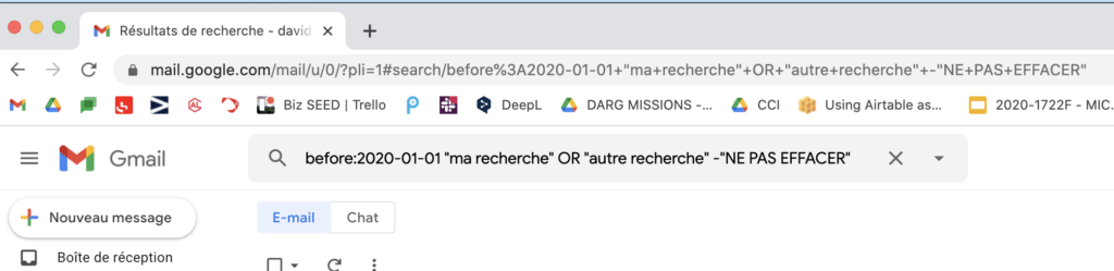 Par exemple, un tri pour rechercher les messages avant le 01/01/2020 avec les termes [ma recherche] ou [autre recherche] en excluant [NE PAS EFFACER] ça donne ça dans la barre de recherche :