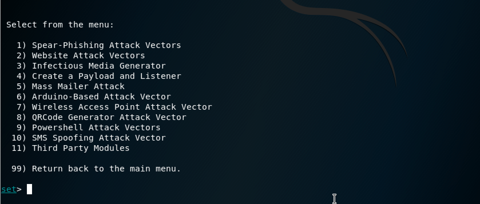 Une fois lancé, seToolkit nous propose un menu pour choisir la façon dont nous allons configurer notre “payload” (charge utile en Français), qui sera caché dans le trojan :