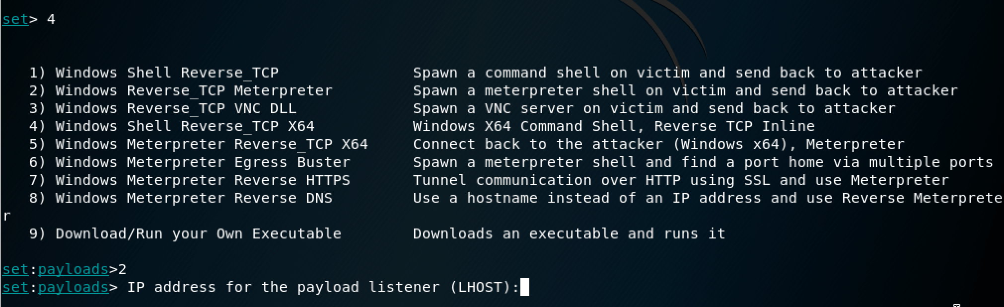A l’étape suivante, nous souhaitons configurer un trojan capable d'ouvrir une console shell sur la machine cible, puis d'en donner les droits à distance à la machine d'attaque. Choisissons donc l’option Windows Reverse_TCP Meterpreter, lorsque l’on nous demande l’adresse IP pour le “payload listener” entrez l’adresse IP de l’attaquant. Pour le port, saisissez le port libre de votre choix (nous prendrons ici le 666 pour des raisons évidentes...).