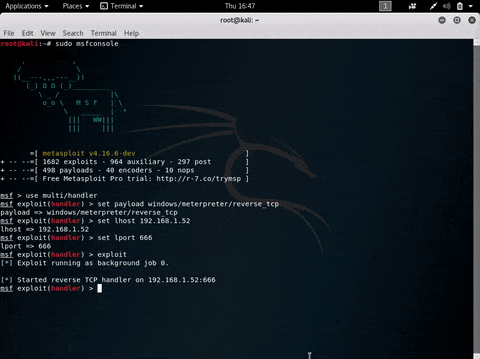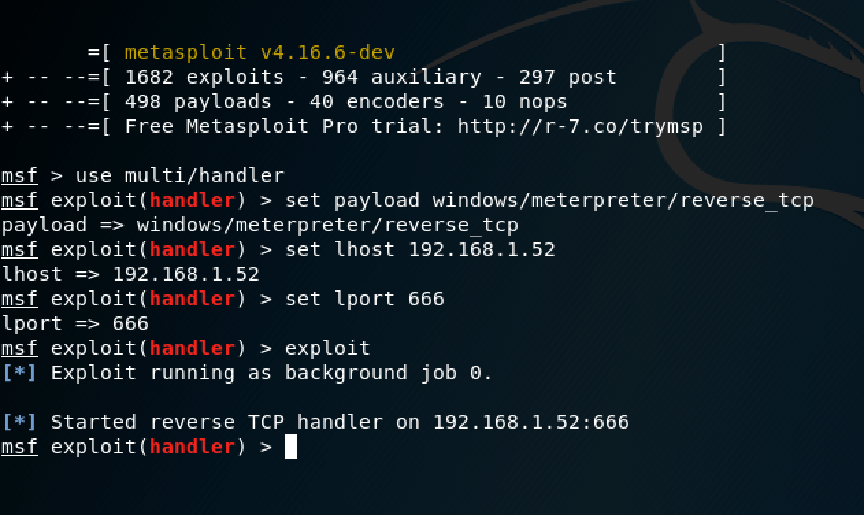 La console Metasploit ouverte, on peut préparer le serveur en spécifiant le type de payload (windows/meterpreter/reverse_tcp), notre IP et le port prévu à la réception de la connexion (les mêmes que l’on a indiqué lors de la création du Trojan).
