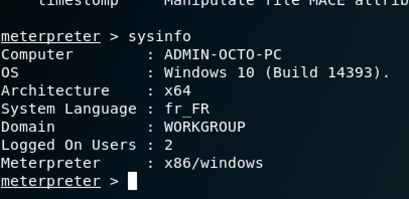 Commençons doucement avec la commande sysinfo, afin d’en connaître plus sur la machine cible :