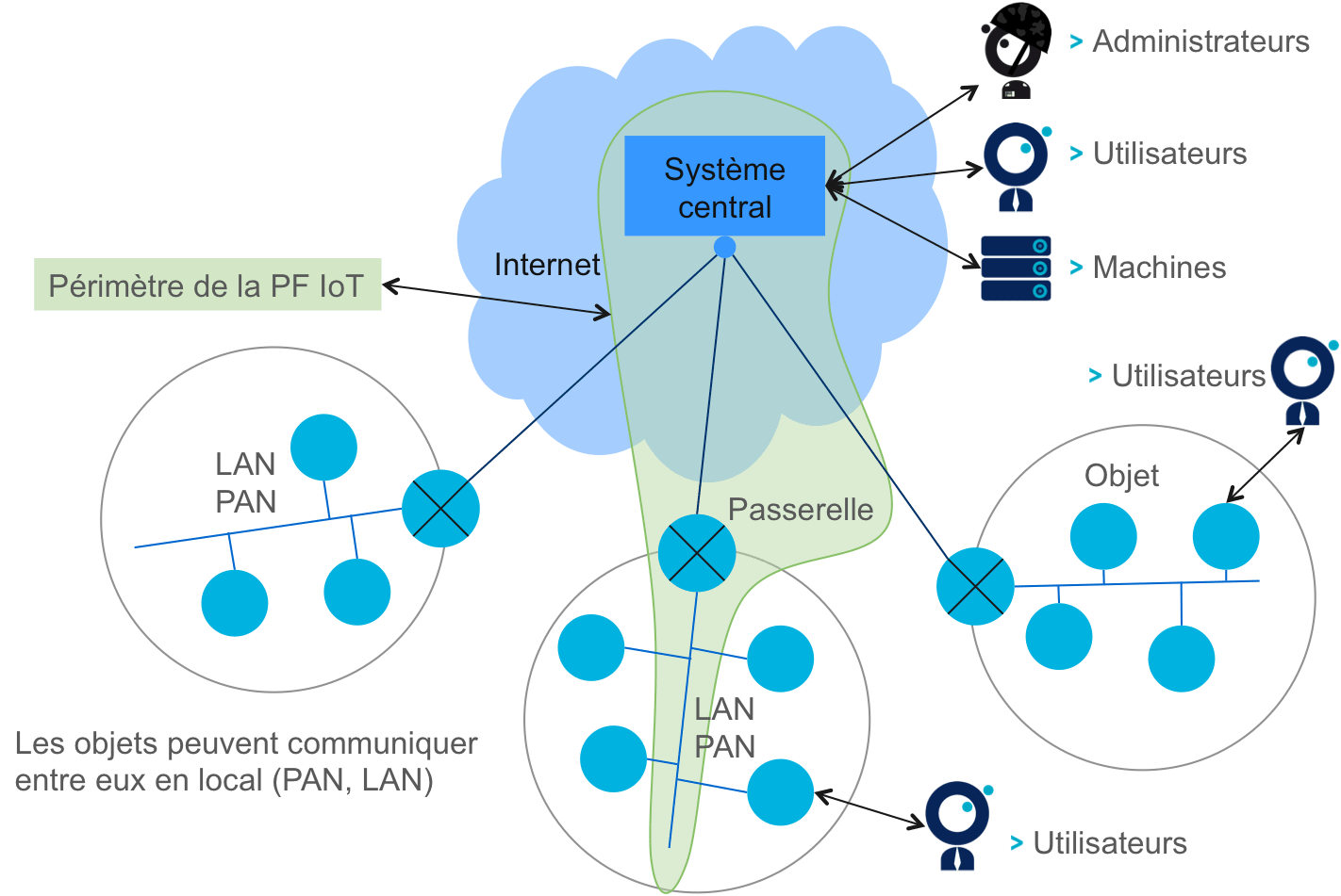 Les objets sont connectés à une passerelle via un protocole de communication (local ou longue distance). La passerelle communique avec un système central qui est accédé par des utilisateurs, des administrateurs et d’autres machines qui portent des applicatifs consommant ou fournissant des données aux objets. Les administrateurs veillent sur le système central, les réseaux de communication et les passerelles.