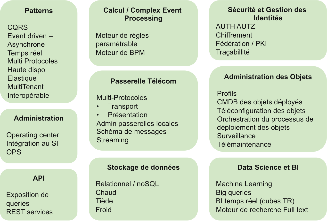 La figure suivante présente les grands blocs fonctionnels d’une plate-forme IoT "idéale" (en ce qui concerne sa complétude). Nous allons les passer en revue.