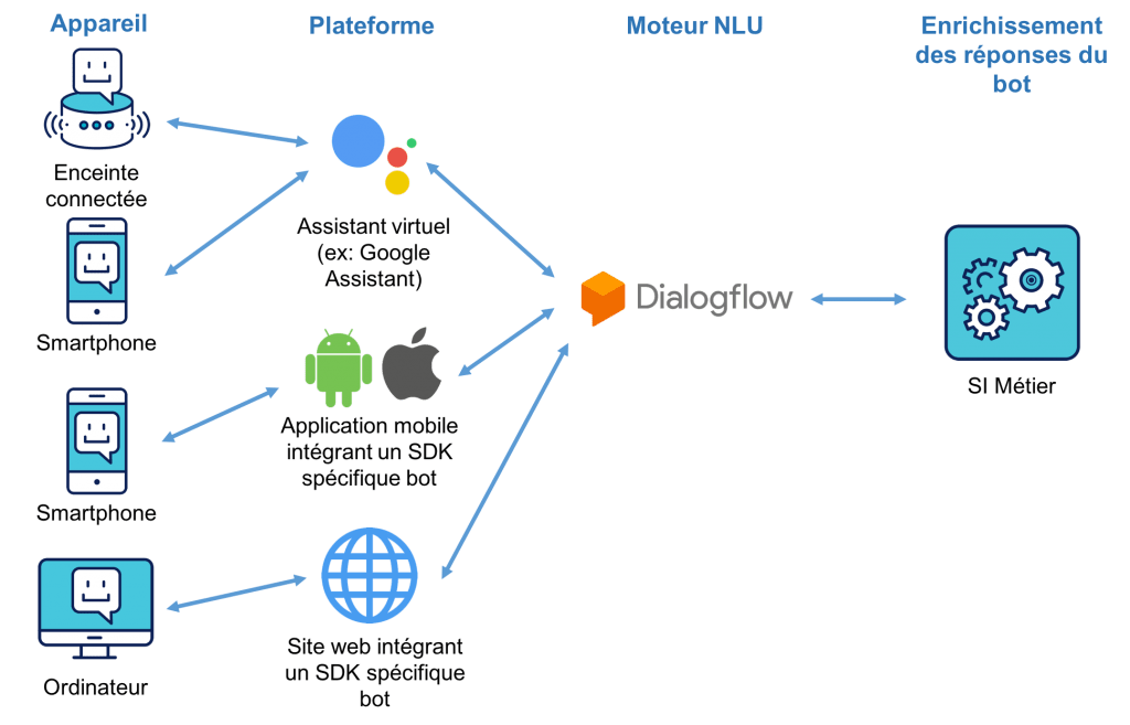 Schéma d’un bot multicanal basé sur Dialogflow