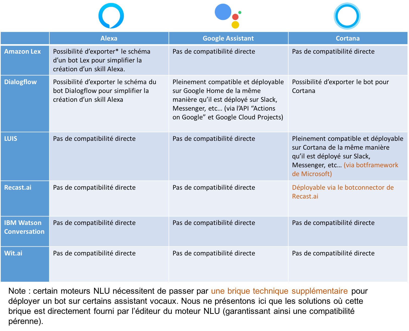 Les possibilitées offertes par les principaux moteurs NLU pour déployer un chatbot vocal sur un agrégateur de bot