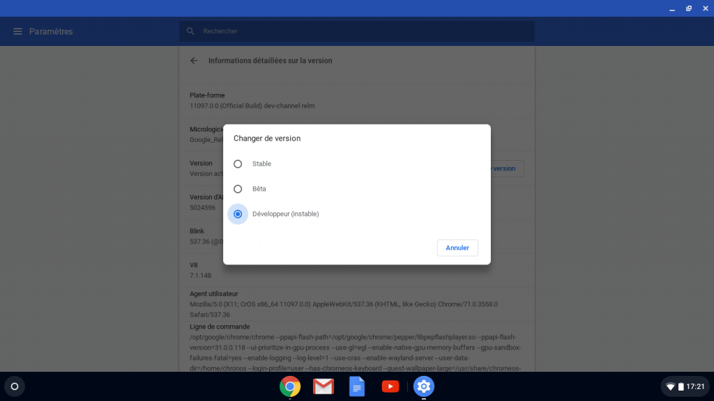 Direction les paramètres, puis dans “A propos de Chrome OS”, cliquez sur “informations détaillées sur la version”. Vous pouvez alors changer de “channel” vers développeur.