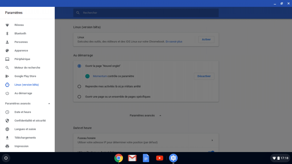Pas de panique, un passage en channel développeur va propulser notre Chromebook en version 71, et me donner la possibilité de créer un container Linux sur ma machine.