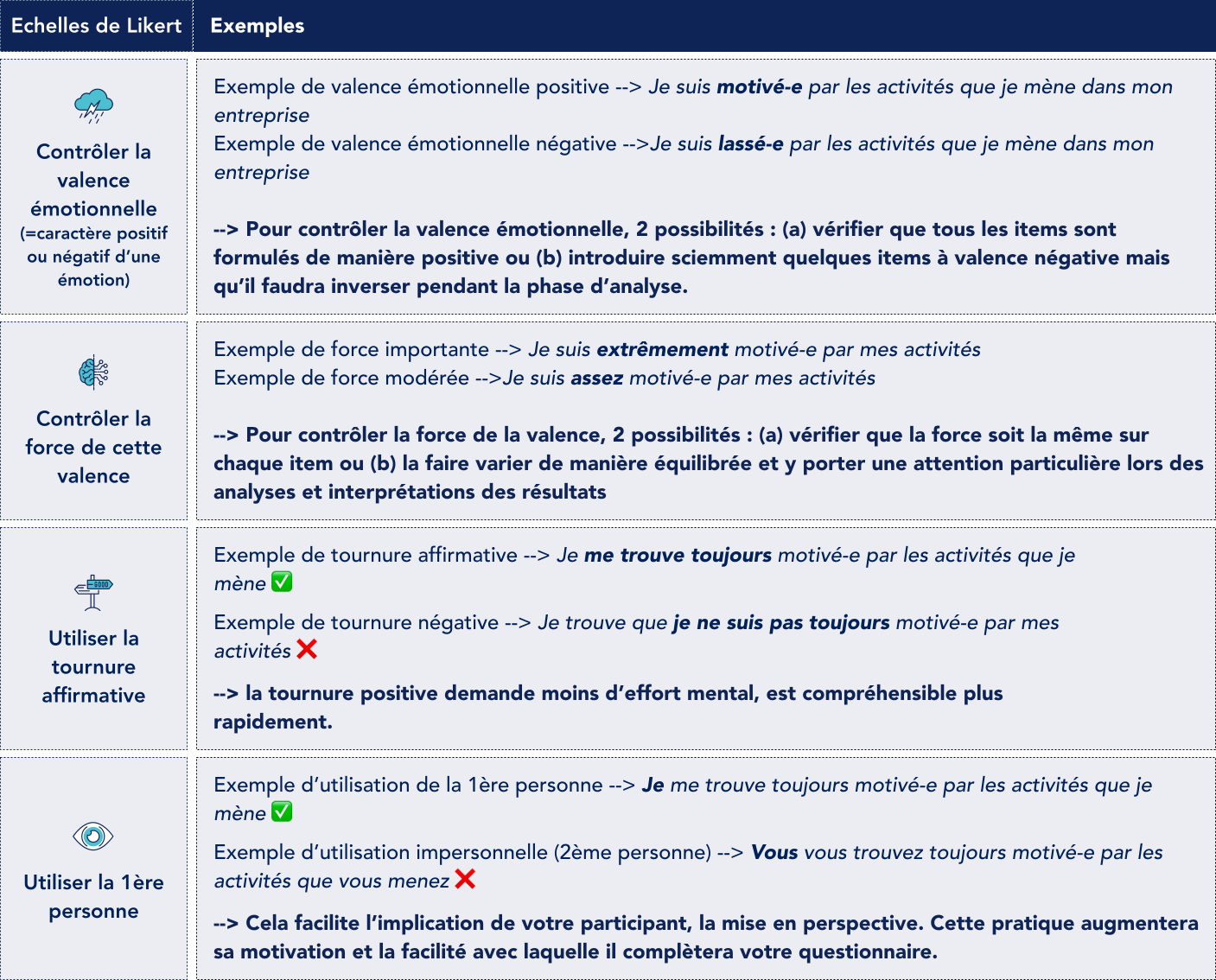 Il existe 3 grands types d'items utilisables dans un questionnaire : les échelles de Likert4 (scores de 1 à 7 points), les items catégoriels et les questions ouvertes. Qu’est-ce que c’est ? et comment choisir ?