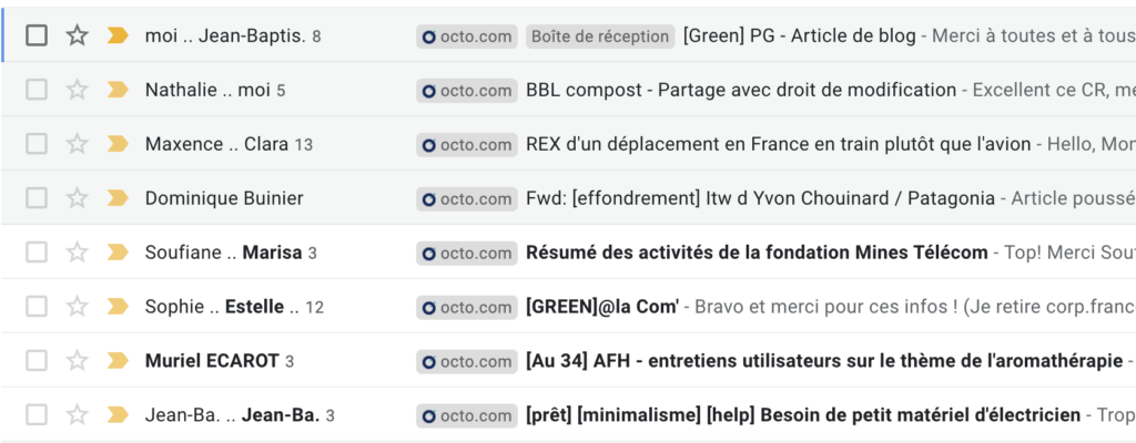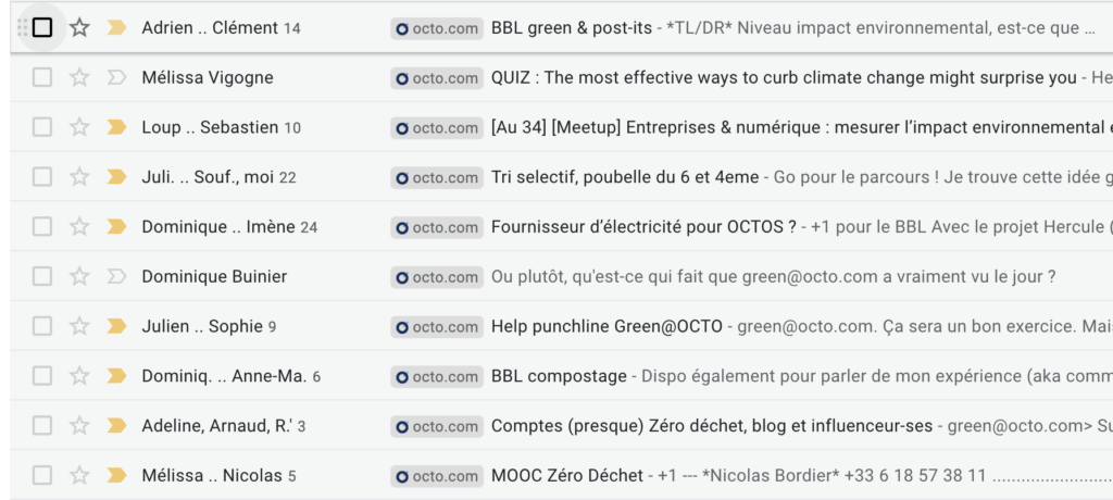 L’initiative avait été lancée il y a plusieurs années par des Octos très touchés (coucou Mickaël !) par la thématique, mais il manquait alors une caisse de résonance en interne. Rebelote il y a deux ans, où nous voyons fleurir des BBLs “Green”, des threads de mails pour comprendre comment OCTO pourrait devenir plus vert, et une nouvelle mailing-list : green@octo.com. Puis, plus grand chose, le quotidien reprend son cours chez OCTO, même si la plupart d’entre nous restent très impliqués dans des démarches éco-responsables personnelles. Faire bouger une PME de 600 personnes, c’est un défi !