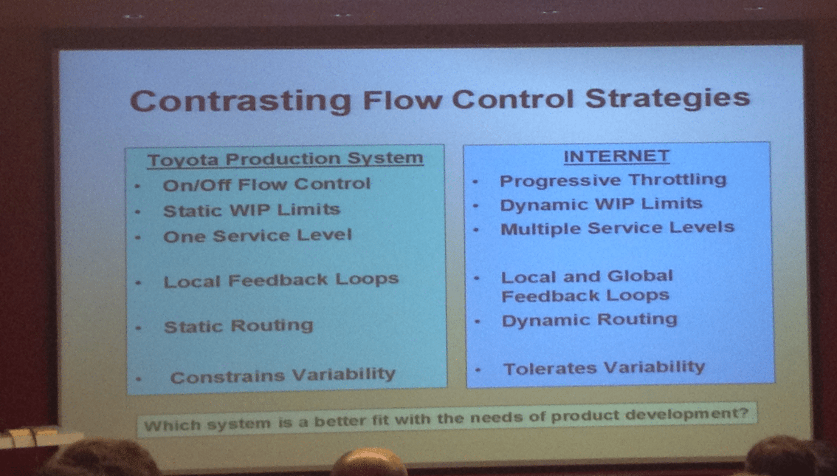 Son propos, c'est : le Toyota Production System (TPS) avec son PULL-system, c'est bien, ça marche, mais c'est empirique, pratico-pratique, et adapté à la fabrication de voitures. Si tu veux réutiliser ces concepts dans d'autres contextes, t'as plutôt intérêt à avoir une approche plus scientifique pour comprendre ce que tu fais.
