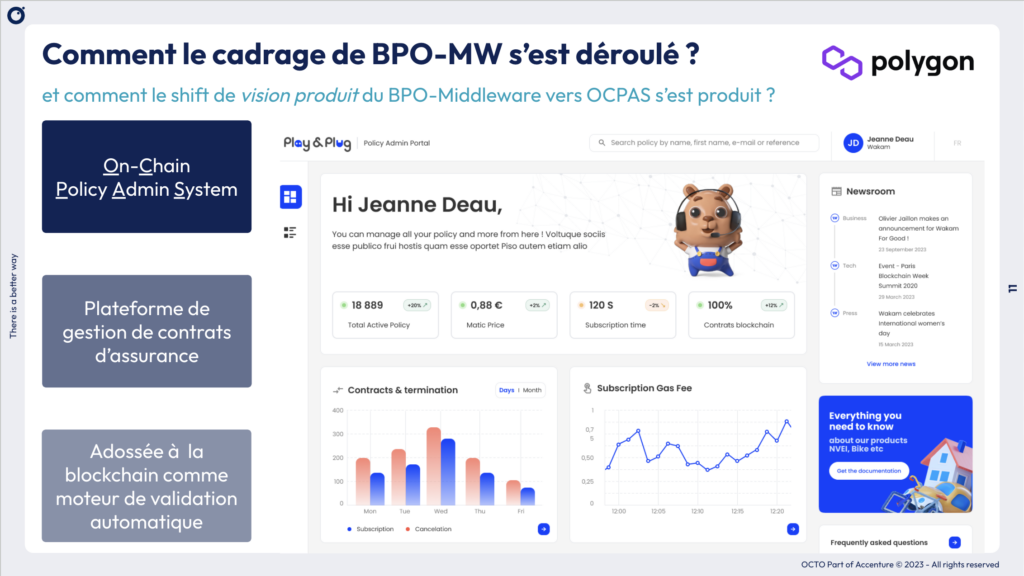 Avec ce but en tête, le cadrage s’est conclu par la décision repousser le développement du BPO-Middleware pour pivoter vers le développement d’une nouvelle solution nommée OCPAS (On Chain Policy Admin System), un Back Office de gestion de contrats d'assurance où la Blockchain va être utilisée en tant que moteur de validation automatique de règles métier lors des différents moments de la vie d'un contrat : souscription, avenant, rétractation, résiliation, renouvellement,