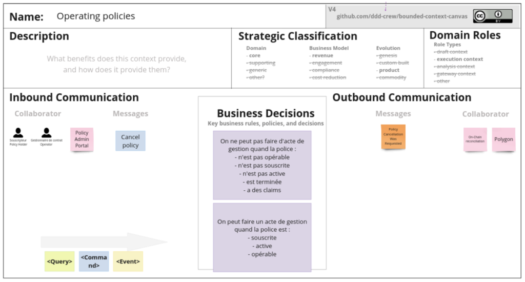 Ce changement de cap amène de nouveaux enjeux notamment sur la gestion des événements et du modèle de données. La méthodologie DDD a aidé l’équipe à avancer dans ce contexte où l’innovation et les incertitudes sur l’adaptation du métier de l’assurance dans la blockchain sont fortes.