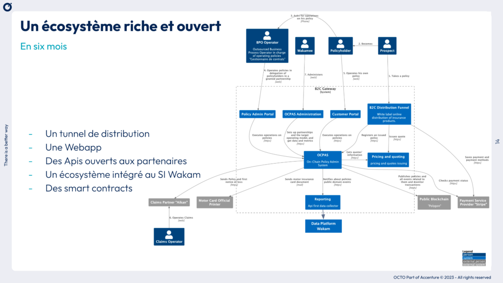 L’innovation : Wakam réinvente son métier et se renouvelle continuellement. Elle fait le pari d’apporter plus de transparence en publiant les contrats d’assurances (ainsi que les actes de gestions liés) sur une blockchain publique. Ce pari a de nombreuses implications sur les processus métier qu’il faudra redécouvrir et repenser en même temps qu’on construit la nouvelle plateforme.