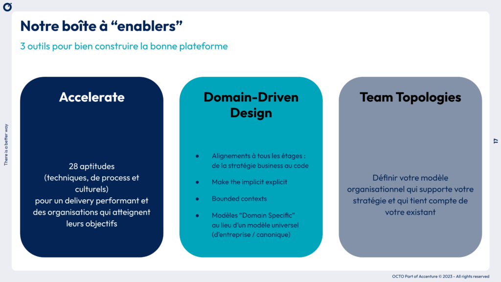 Accelerate nous démontre que livrer en continu nécessite de développer de nombreuses autres aptitudes techniques (12 précisément). Parmi elles, on trouve le trunk based development, le test en continu et les architectures modulaires faiblement couplées. Le Domain-Driven Design nous a été très utile par rapport à ce dernier point.