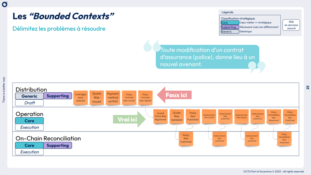 Il faut garder en tête qu’un “bounded context” n’est pas juste un “mot” mais une délimitation claire et formulée explicitement et partagée d’un problème à résoudre (pro tip : méfiez vous des bounded contexts de type “Client”, “Produit”, “Facture”...).