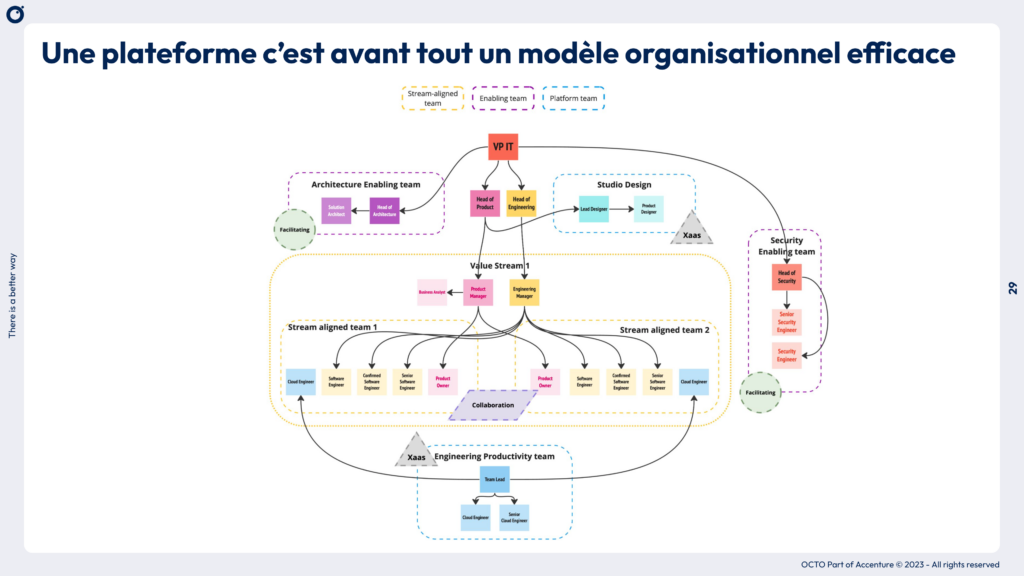 Néanmoins, pour avoir un modèle organisationnel efficace, il a fallu aussi que les rôles et les niveaux de collaboration inter-équipes (avec les équipes externes aux équipes de réalisation de la nouvelle plateforme) soient clairs et définis.