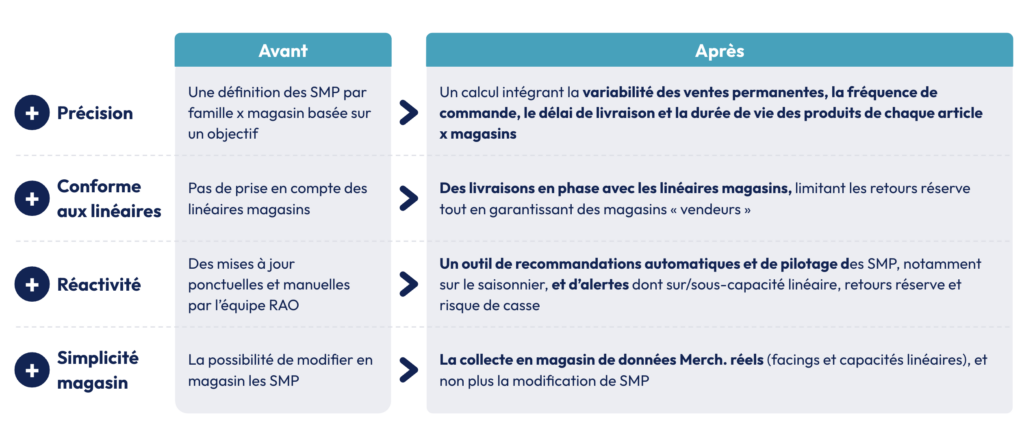 Ainsi, les équipes magasins gagnent du temps sur la mise en rayon (pas de retour réserve) et sur le pilotage des commandes, avec un calcul centralisé et une saisie locale du merchandising.
