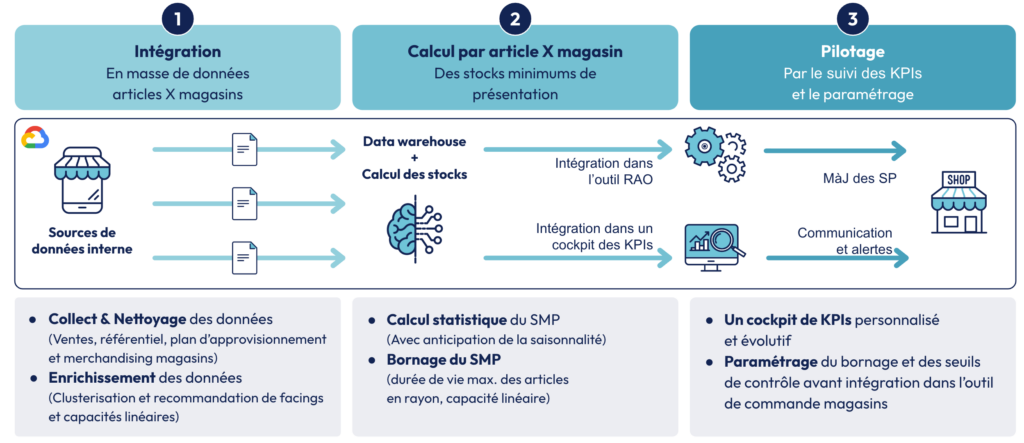 INTEGRATION, en masse de données articles X magasins avec la collecte et le nettoyage des données (ventes, référentiel, plan d’approvisionnement et merchandising magasins) et l**’enrichissement** des données (clusterisation et recommandation de facings et capacités linéaires). La clusterisation a un rôle clé dans le déploiement, elle a permis un déploiement rapide en capitalisant sur les collectes réalisées par certains magasins pour permettre une extrapolation à d’autres et en environ 10 mois avoir près de 80% du parc magasins déployés.