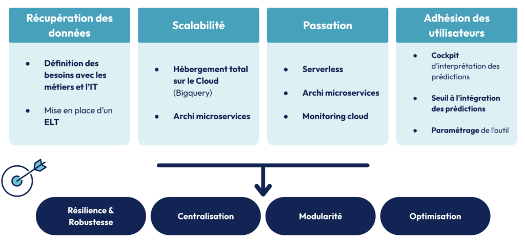 Nous avons donc mené un projet sur 8 mois, avec une approche progressive, dont une première phase de design et un premier POC après environ 2 mois sur un périmètre de produits (10 familles) et de magasins (4) considérés comme permanent. En parallèle, nous avons continué le développement de nouvelles fonctionnalités pour le lancement d’un 2nd POC vers le 4ème mois sur 14 familles et 20 magasins , avant le déploiement de la solution et la mise en place du mode de fonctionnement après 8 mois.