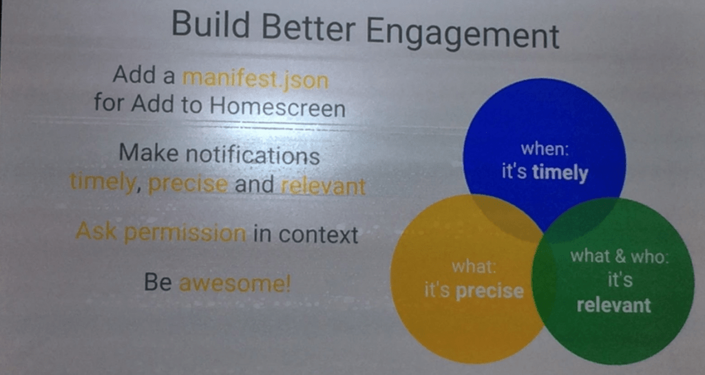 - Re-engageable : le réengagement (réutilisation) peut être amélioré grâce à des fonctionnalités récentes du web comme les push notifications dans le navigateur et le “add to home screen” qui lui permet de s’afficher comme une application native (cf : Deep Engagement: Installable apps and Push Notifications)